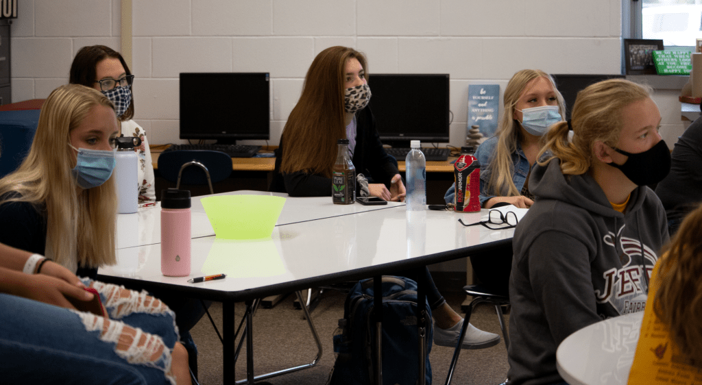 Right: NHS members Alissa York ’22, Harlie Blas ’21, Taylor Gustafson ’21, Keely Schramm ’21 and Maggie Layton ’21 actively listen during the meeting. First-year members had the opportunity to finally attend an official meeting after the formal induction and all other gatherings last school year were postponed or cancelled due to Covid-19. Photo by Lindsey Korthals