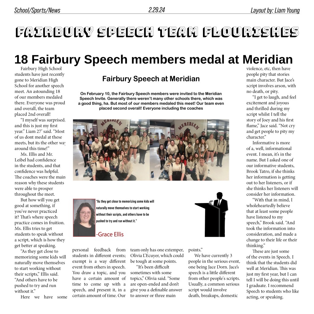 Main Page Fairbury Speech Team flourishes Liam Young 29 Feb 2024 0 Comments Share this: Share on X (Opens in new window) X Share on Facebook (Opens in new window) Facebook Like Loading... Related CategoriesMain Page